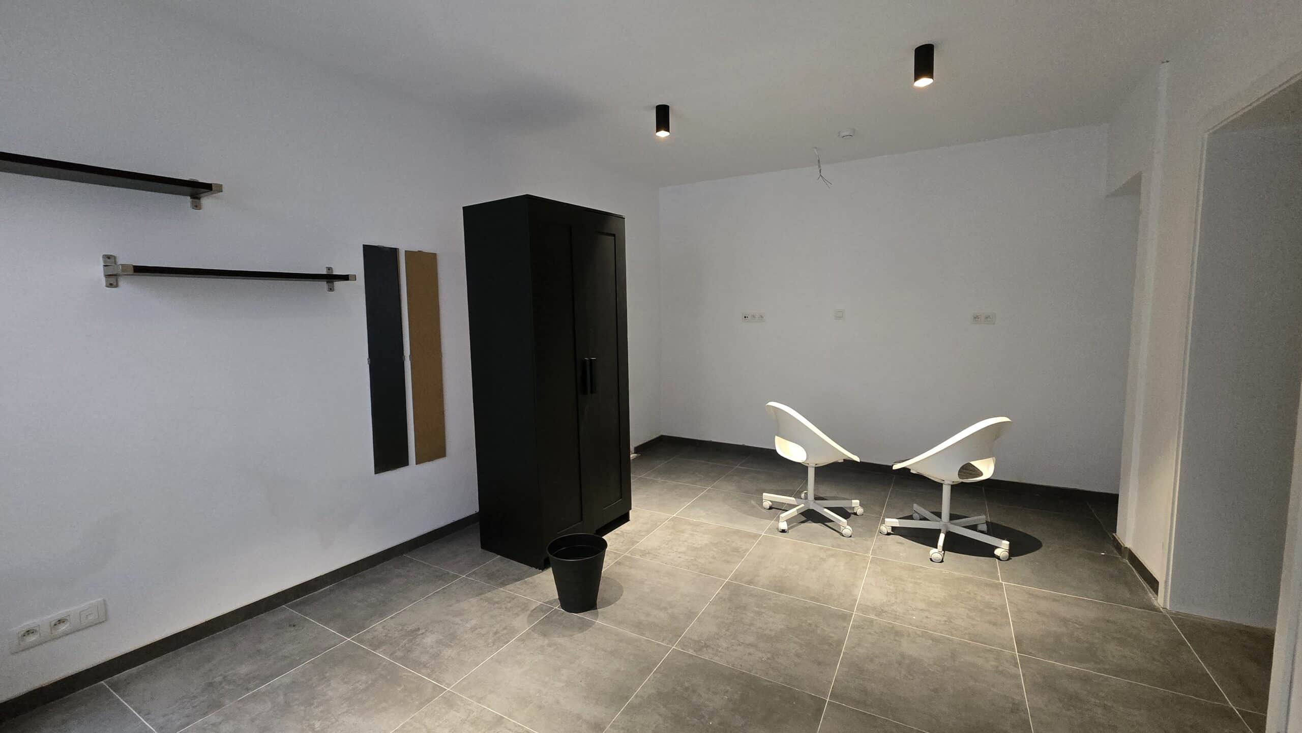 1 chambre disponible, comprenant : un lit avec sommier, un bureau, une garde-robe, une chaise de bureau, une poubelle.