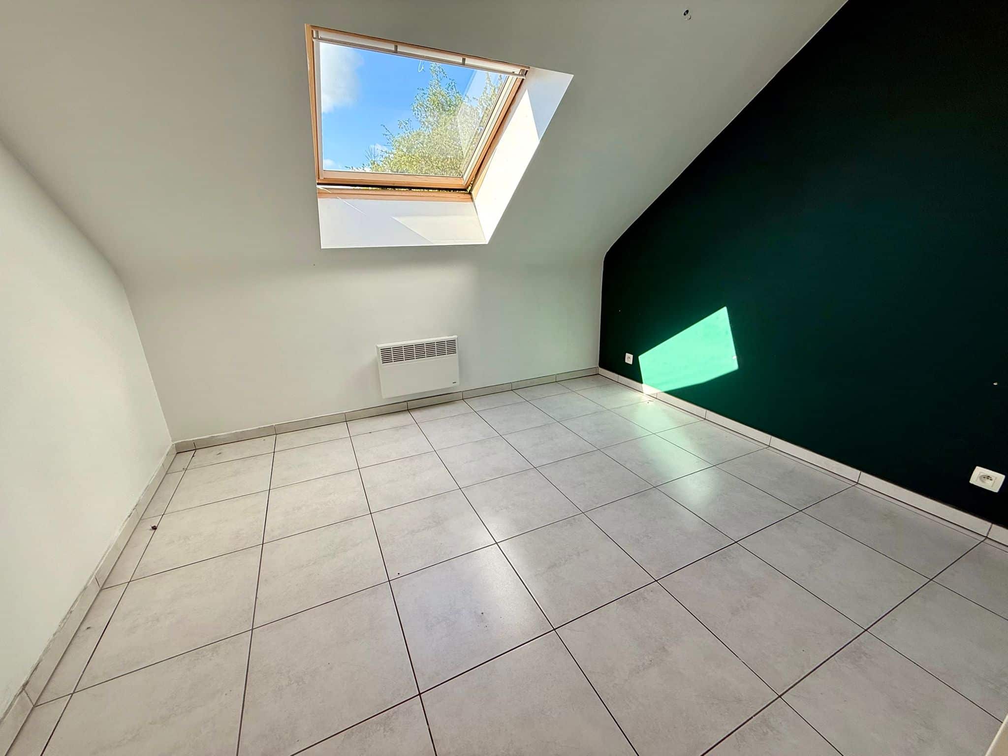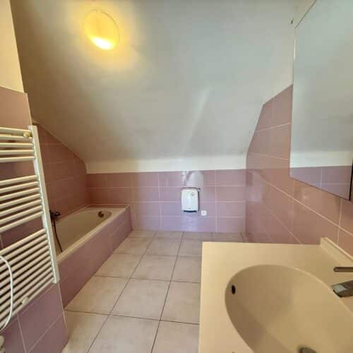 Hall d'entrée desservant, le séjour, cuisine équipée, salle de bain, chambre.