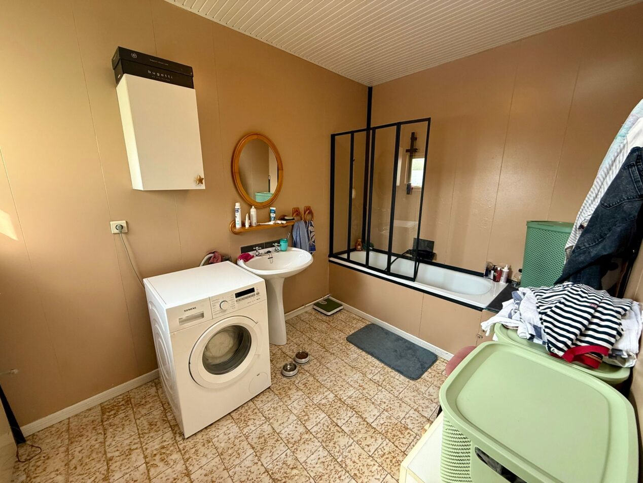 hall d'entrée desservant séjour, cuisine, salle de bain, buanderie, accès vers l'extérieur.
