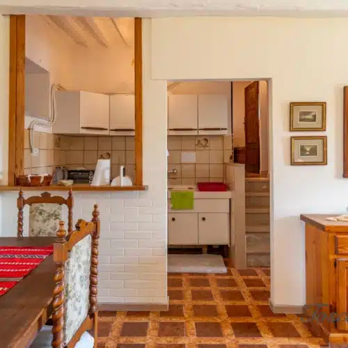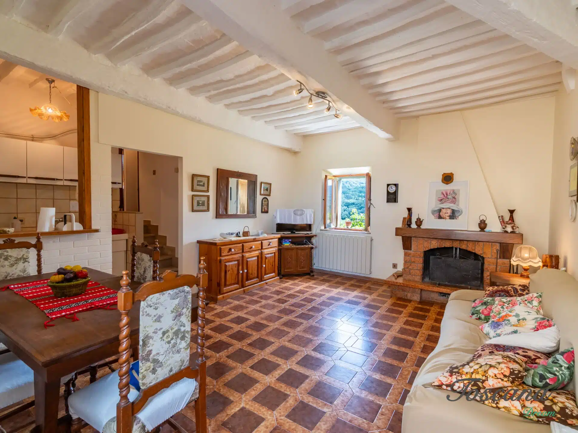 L’appartement s’étend sur deux niveaux, il est lumineux et plein de charme, avec des poutres apparentes et une cheminée rustique qui domine le salon, créant une atmosphère chaleureuse et accueillante.