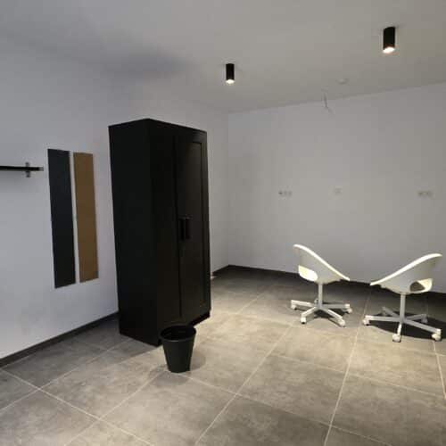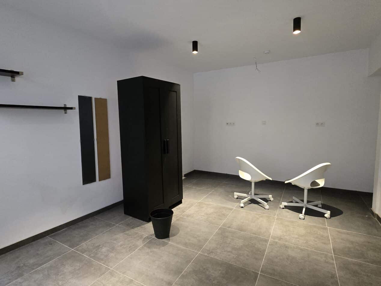 1 chambre disponible, comprenant : un lit avec sommier, un bureau, une garde-robe, une chaise de bureau, une poubelle.